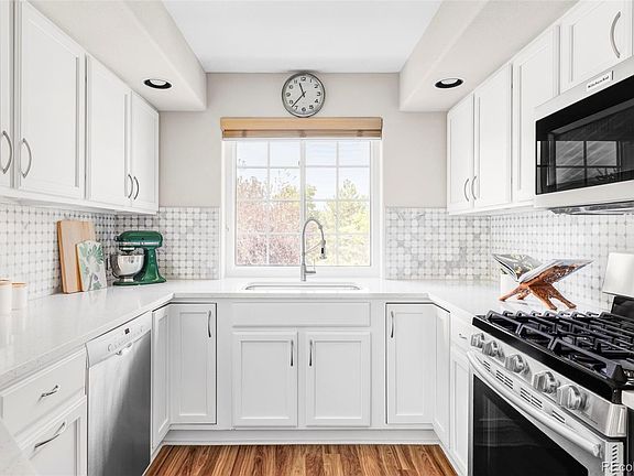 Interior Highlights: Sun-drenched end unit with vaulted ceilings and expansive windows framing lush green space. Fully updated flooring and carpet throughout — modern, cohesive, and move-in ready. Gourmet kitchen featuring: Quartz countertops, Stainless steel appliances & gas range, Contemporary tile backsplash, Painted cabinetry with modern hardware. Luxury primary suite with: Enlarged walk-in shower with frameless glass enclosure and soaking tub, New tile flooring and tiled shower surround, Dual sinks with updated quartz countertops, sinks and faucets, Large walk-in closet. Recent Upgrades & Comfort: Brand new Trane HVAC system for year-round comfort, New windows and sliding patio door — energy-efficient and modern, New front-load washer and dryer (included), EV charging installed in the garage — perfect for electric vehicle owners, Private 1-car garage with additional storage, plentiful parking spots open along Eliot Circle for resident use. Outdoor Living & Community Amenities: Relax on your private balcony with scenic views of a manicured greenbelt, Enjoy resort-style amenities in the Legacy Ridge community: Swimming pool & hot tub, Tennis & sand volleyball courts, Access to Legacy Ridge Golf Course and miles of scenic trails. Centrally located with easy access to I-25 and Hwy 36, this home is minutes from parks, trails, top-rated schools, grocery stores, dining, and shopping. This turnkey home is perfect for first-time buyers, downsizers, or anyone looking for low-maintenance luxury living in a serene, well-maintained community. Every detail has been carefully updated — simply move in and enjoy! Schedule your private showing today — this beautifully upgraded home won’t last long!