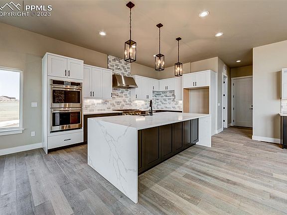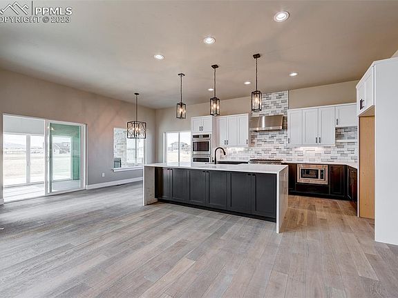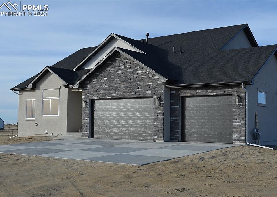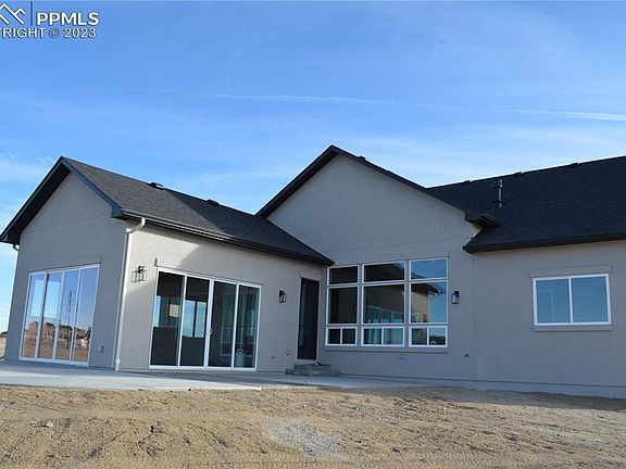 This new build is complete. Beautiful Custom Ranch on 4.78 Acre Lot with unobstructed Pikes Peak and Front Range view. Open and Bright floorplan features eight foot doors throughout, great room with a linear fireplace and twelve foot ceilings. Large kitchen features custom cabinets and countertops, gas cooktop, double ovens, built in microwave and walk in pantry. Adjoining dining area walks out to fully enclosed outdoor living area with gas fireplace. Master Suite features a private bath with an oversized walk in closet, walk in shower and free standing tub. Private guest suite with adjoining bath and ample closet space. Main level study can also be used as a dining room. An additional half bath and laundry room complete the main level. Basement features nine foot ceilings, two additional large bedrooms, a theatre room that can be used as a bedroom, a full bath with double sinks, wet bar and plenty of storage. Home includes 2 X 6 Construction, Fully finished insulated garage. Please call for additional information. FLOORPLAN IS IN DOCUMENTS.