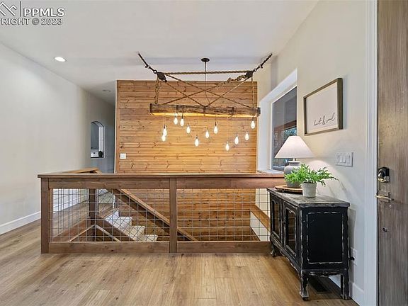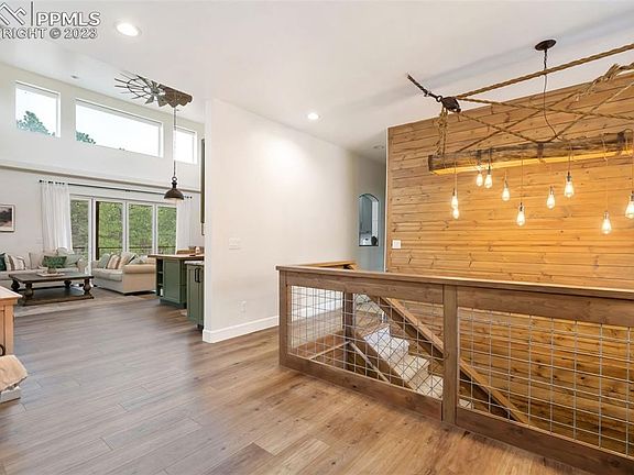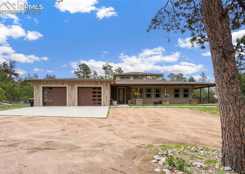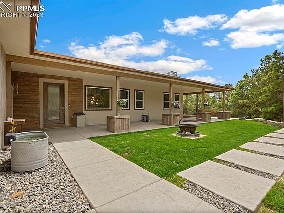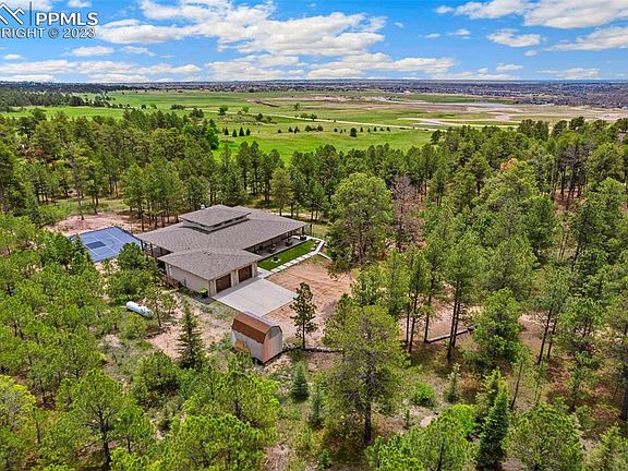 Luxurious Black Forest rancher on 5.5 private acres in award winning D-20! 5,000 sq ft of well-designed space. 5 bedrooms, 6 baths. Impressive entry, open concept main level with 18' kitchen ceilings. The cozy living room showcases a fireplace with built-ins and stack & slide doors that open to the 1900 sqft fully covered wrap around deck. Ambrosia Maple island, shaker cabinets, granite counters, double dishwashers, stainless steel appliances, drink fridge, and a huge pantry finish out the kitchen. Primary suite with his and hers everything, including custom closets! 2 additional bedrooms with private baths and walk in closets, barn door office, and an expansive mud room and laundry with hook ups for double washer and dryers complete the main level. The walk-out basement features stamped concrete floors, a full kitchenette, powder bath, workout room, family room, huge storage space, and a safe room. Find two additional bedrooms with walk-in closets and Jack-n-Jill bathrooms showcasing zero entry showers. The pellet stove and overhead garage door create the ultimate experience in indoor/outdoor Colorado living. Brush up on your game with your own private basketball sports court (premium all weather shock reducing flooring) and cool off on the outdoor patio in your secluded and scenic backyard. The significantly oversized 2 car garage is spacious enough for your cars and toys! Insulated Concrete Form (ICF) construction is energy efficent and gives high levels of insulation and foundation strength. An impressive cottage offers a unique opportunity for a studio or private office, in-law suite, or rental opportunity. Highlights include a kitchenette, laundry, bathroom, and loft space. 2 additional outbuildings could be used as a fenced in chicken coop and "she shed" or greenhouse. Premier windows, A/C, motion activated lighting in closets and pantry, no HOA. Fully fenced and electric pet fence. Conveniently located close to town giving you the best of both worlds!
