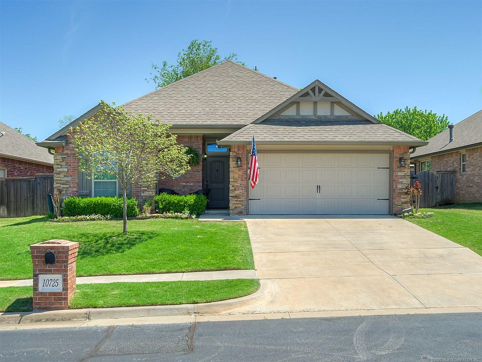 Cozy & sophisticated one-level in gated community in Jenks, just off Hwy 75. Easy commute to Tulsa Hills, downtown Tulsa, & major highways. Solid hardwoods, gas fireplace, 10ft ceilings, granite countertops, tiled master shower & separate soaker tub. This 3bed;2bath;2car is just the right size, move in ready, & in a lawn maintained community!