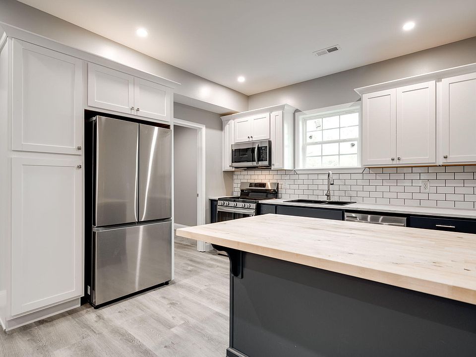 Stylish Updates: Step inside to find new windows, contemporary lighting, fresh interior paint, and durable LVP flooring throughout. The kitchen features sleek stainless steel appliances, new shaker-style white cabinets, and a combination of textured countertops along with butcher block kitchen island countertop.