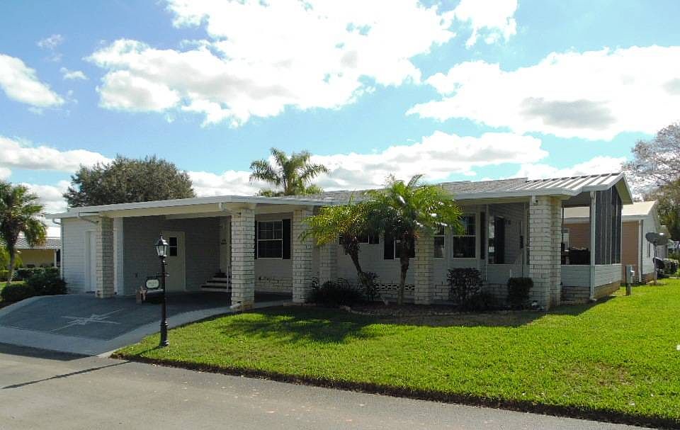 Lot 175 has an awesome split floor plan that has been well cared for and is a delight to the eye when you walk through the door. Located on a large corner lot on a quiet street with low traffic you'll appreciate the privacy this location has to offer. Drywall is featured throughout the main living area and bedrooms. All new carpeting installed in 2017. Enjoy a sneak peek view of the golf course from the Lanai. New Roof in 2015 and New A/C in 2017. Home is being sold mostly furnished and purchase includes golf cart plus ONE YEAR FREE GOLF!