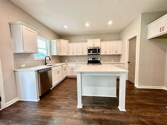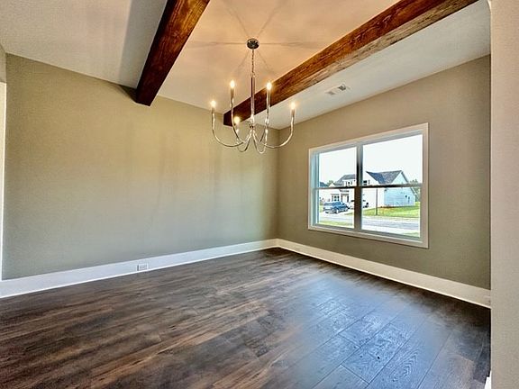 The spacious TIMBERLAND PLAN features entry foyer with columns leading to Study on one side and beautiful Dining Room on the opposite side. Dining Room Features Stained Beams. Family Room fireplace boasting brick surround. Kitchen features shaker styled cabinets, quartz counters, designer selected tile backsplash, and walk in pantry! Stainless Electric Range/Oven, Dishwasher, and Microhood. Guest Bedroom and Bath on main level.