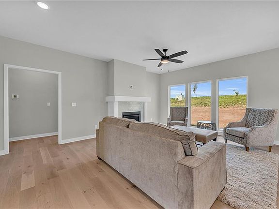 **This villa is ready for immediate occupancy!** The Meg by Hearthside Homes has an open floor plan with 3 bedrooms and 2 bathrooms, all on the main level! Primary Bath offers dual vanity and shower with a rollover threshold. Secondary bath offers a bathtub and shower. This lot provides an exit from the dining area directly to the covered patio. No need to go down all those steps to access your backyard! Fences are allowed here! An unfinished basement allows for future finish & includes rough in for a full bath. Some of the upgrades in this home include Quartz Countertops in the kitchen, all tile in the primary bath, gas fireplace in the great room, ring door bell, entry door with Wi-Fi key pad & plug for your electric car. Main living area has wood floors, bedrooms have carpet. Villa homeowners will also have an annual HOA fee of $565. Taxes, lot size, sq footage and room sizes are estimated. A Hunt Midwest Maintenance Provided Community.