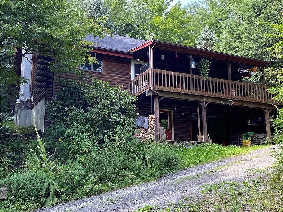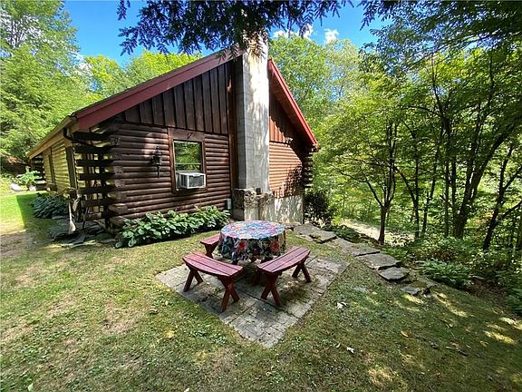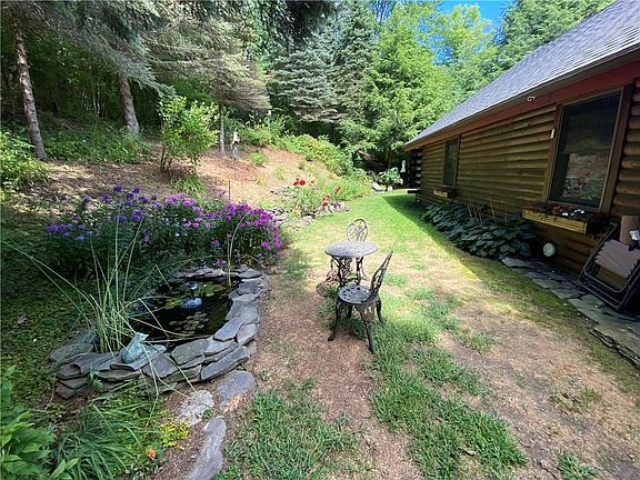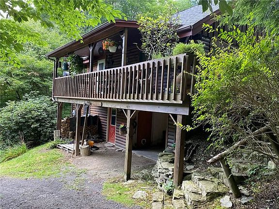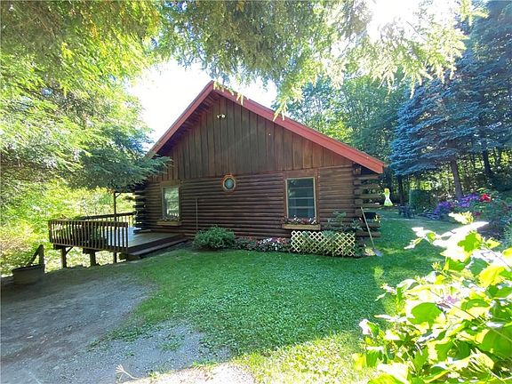 Beautifully maintained authentic log home, surrounded by private woods, peaceful gardens and abundant wildlife. Features 2 large Bedrooms and one full bath on first floor, unfinished 2nd floor has additional space for 2 additional bedrooms and bath. Large open floor plan includes a unique Tulikivi designed soapstone fireplace/stove, to easily warm the combined Kitchen, Dining and Living Room area. Full basement and garage. Outside a large partially covered wrap around deck overlooks the tranquil wooded valley. Newer hardwood floors, large living room skylight. Nearby wineries, skiing, golf and hiking trails. This must see rare find is a great place to call home or a "vacation getaway".