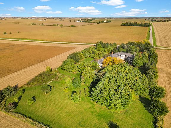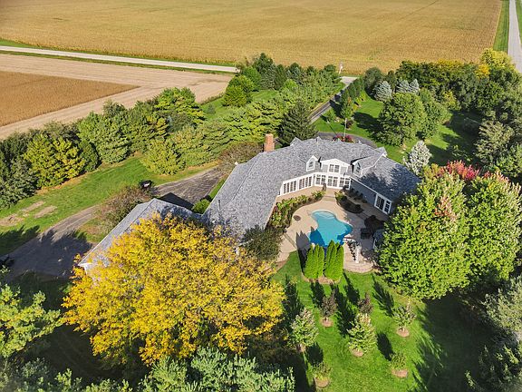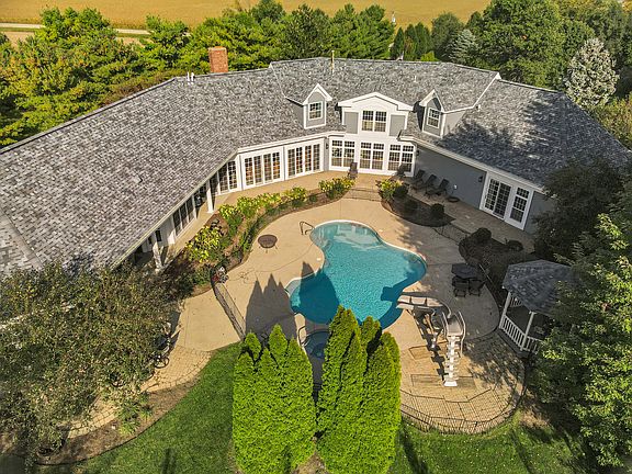 Embrace the charm of countryside living on 5 acres of pure tranquility. This sprawling 5,000 sqft Estate invites you to experience the beauty of rural life! This architectural build provides ample sunlight with stunning sunset views throughout the entire backside of the property. The extensive brick paver patio surrounds the salt water Gunite pool, hot tub, gazebo and outside seating areas -making this a summer's oasis! Inside you will be delighted to find a gourmet kitchen with chef's pantry, and an attached breakfast nook overlooking the private wooded yard and fruit trees. The granite countertops, deep copper penny-nail sink, and high end appliances will be sure to impress any guest this holiday season. Relax in the four seasons room, or study in the nearby office featuring custom Knotty Pine built-ins and a wood burning fireplace. Host game night in the enhanced and generous family and living room combo; which includes a massive stone fireplace, wood columns and built-in shelving. Pass through the two story sun filled hallway into the private first floor primary suite, encompassing a fireplace and patio entrance, separate tub and shower, water closet, and large walk in closet -featuring a bonus laundry hook up. The separate laundry room includes a Samsung washer and dryer with upgraded Ozone Eco Pure technology. Additional full and half bathroom, complete the first floor. Upstairs you will find 3 additional bedrooms and 2 full bathrooms. The partially finished 1,000 sqft basement is ready for your ideas! Windows throughout home were replaced in 2019. The roof, vinyl siding, Hardie board trim, gutters, and garage doors all NEW in 2019. All 4 house furnaces replaced in 2019, with additional garage furnace replaced in 2017. The heated 4 car garage is equipped with 4 garage doors, giving ultimate accessibility for outdoor hobbies. Elaborate water and air filtration system installed and maintained. This land is primed for homesteading activities and independent living!