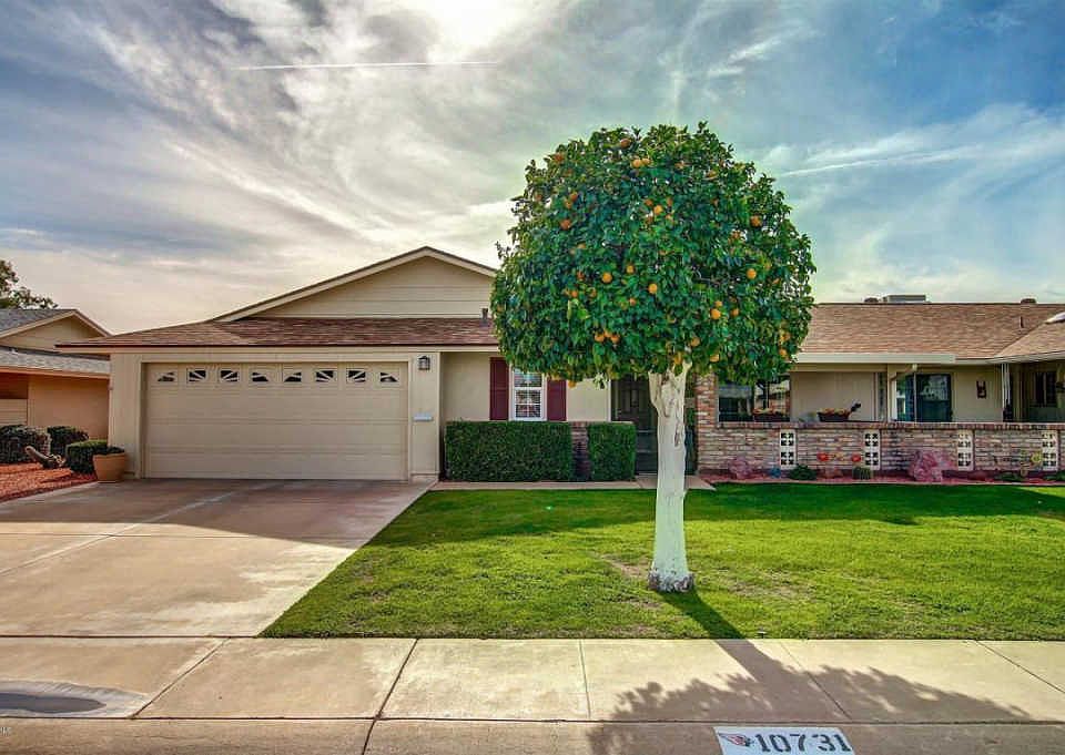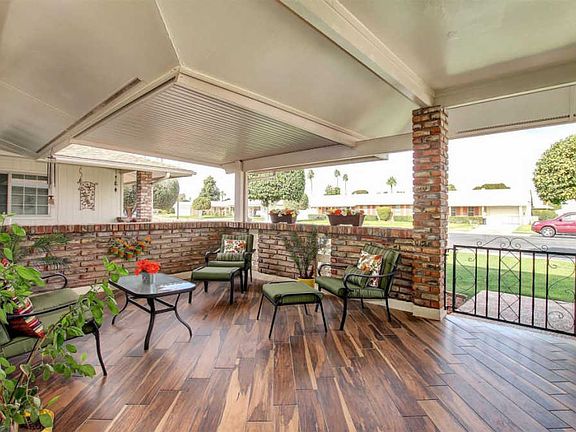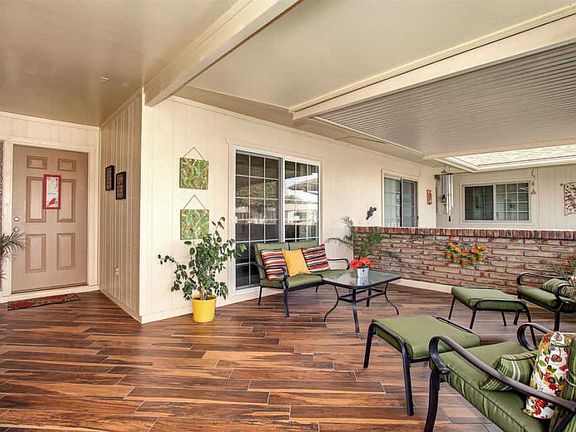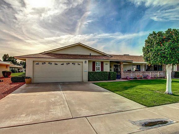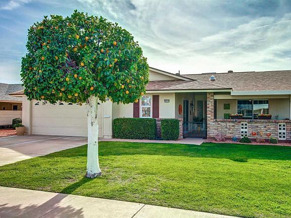 A stunning jewel in Sun City for the most discriminating of tastes. This is an expanded 2 bed, 2 bath with upgrades inside and out with nothing left untouched. It is situated on a N/S greenbelt lot with citrus trees, covered patios in the front (porcelain tile) & back (pebble coated) to enjoy the views. Features inside are the living and formal dining areas with gorgeous rock accent walls, new flooring & baseboards throughout, updated paint schemes, custom blinds, updated bathrooms and kitchen, 2 car garage with plenty of storage. Solar panels reduce the electrical bill to approximately $10/mth. Too many upgrades to mention: flawless owner initiated designs make this a "must see" on your list.