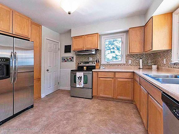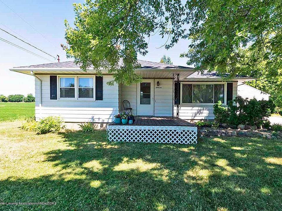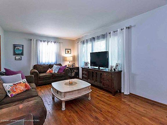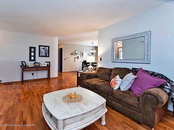 Adorable 3 bedroom ranch with private views in Grand Ledge! Striking hardwood floors on the main level flow through from the entrance into the dining and bedrooms. The updated kitchen with beautiful back splash, newer stainless steel appliances and wainscot detail is large in size and offer space for an informal eating area. The conveniently located dining room is adjacent to the kitchen and offers a beautiful view to the back yard. The lower level is finished with a family room with projector & viewing area, large bedroom with egress window and ample storage. Additional storage is found in the 2.5 car garage with overhead storage. On .67 acres with a completely private rear view and neutral décor, this home is move in ready! Many updates including newer roof.