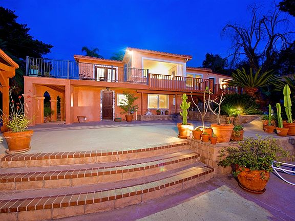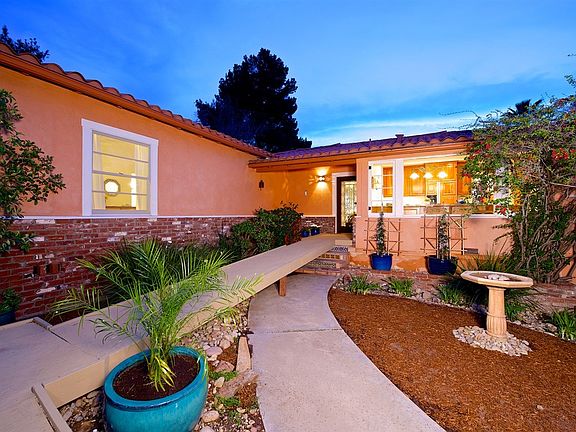 Charming authentic Spanish in central Mt Helix. Private cul-de-sac setting with panoramic sunset and ocean views. 2 BRs 2 BAs on main level; additional BR 2nd family room and kitchenette downstairs could be separate quarters. Upgraded kitchen with granite counters stainless appliances and large pantry. Wood-paneled family room with beamed ceilings brick fireplace and French doors to private patio. Saltillo and hardwood floors custom leaded glass entry ceiling fans. Please see supplement.