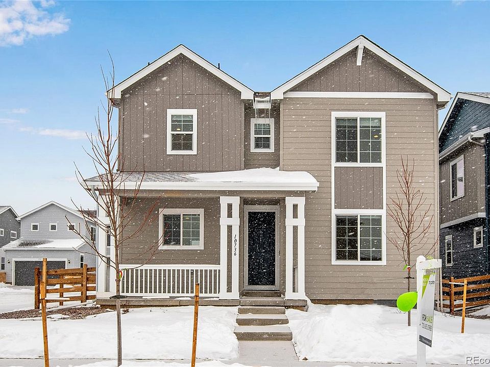 Estimated move-in January! Corner homesite location near Reunion Park and Coffee House. Spacious home with numerous enhancements throughout. The kitchen features gorgeous white quartz countertops with subtle veining, maple cabinetry with a slate stain color and soft close doors, Whirlpool stainless steel appliances including gas range, microwave, dishwasher, refrigerator and a farmhouse style kitchen sink. Soft grey wood style laminate flooring is included through out most of the main level. The primary suite is also appointed luxuriously with quartz countertops, spa shower with a sleek frameless enclosure, stylish framed mirrors, undermount sinks and 12x24 tile floor with a contemporary marble look. The outdoor living provides a desirable retreat with a covered patio and situated on a corner homesite. Located in the desirable Reunion neighborhood, with an in-community elementary school, large rec center with outdoor pool, gymnasium, fitness center and multipurpose areas. Plus a network of trails, 150 acres of parks and a community coffee shop. In addition to top notch amenities, Reunion also hosts numerous community events through out the year for their residents. HOA is a metro district, in addition to fees that are incorporated into the property taxes, there is an additional HOA fee of $109.50 per quarter. Taxes are TBD - taxes are currently assessed on land value only, so the amount shown is an approximated based on the purchase price and tax rate. Est. annual taxes are approx. 1.5% of purchase price.
