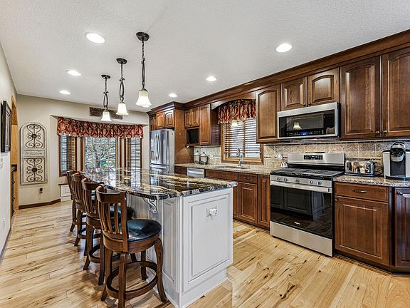 Welcome to this meticulously maintained, one-owner home. You will be greeted by an inviting stamped concrete patio that leads to the front door. As you enter you will notice the updated stairway with beautiful wrought iron spindles. Stunning, fully remodeled kitchen with 9' island, granite counters, cherry wood soft-close cabinets, pull-out shelving, spice drawer and brand new stainless steel appliances. Gorgeous hickory floors flow throughout the kitchen and living room. Dining area leads to deck. Renovated main floor bath. Primary suite features private 3/4 bath and walk-in closet. Cozy up to the fireplace in the remodeled family room with LVP flooring and barnwood wall. Insulated 3 car garage is a dream for all of your projects and includes the workshop cabinets. Pull down ladder leads to extra storage space. Fully-fenced in yard surrounds a well manicured lawn and landscaping, plus a shed for all of your yard care items. See feature sheet from the sellers attached.
