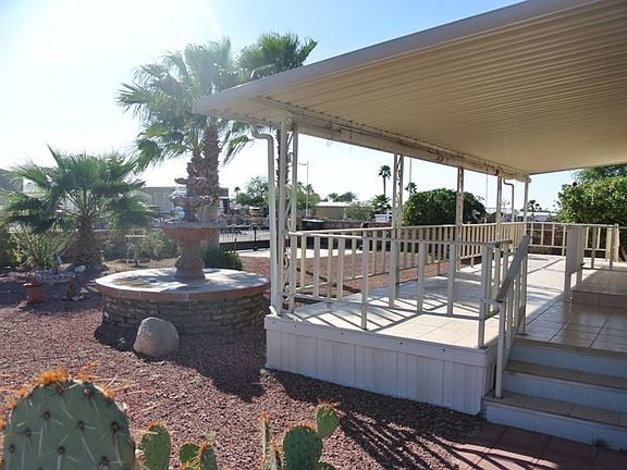 Capture this remarkable "Oasis" for your own! Great views, a grand water feature, lush palms & cactus adorn this corner lot. A full-length covered deck makes it easy to get acquainted. Tall ceilings, abundant windows & open floor plan create a feeling of spaciousness. Check out the master bedroom featuring french doors, walk-in closet, sitting area & en suite. 2nd bedroom for overnight guests or a home office. 2 covered parking areas, storage shed, RV access/hookup. Energy Eff Roof. Furniture/furnish stay.
