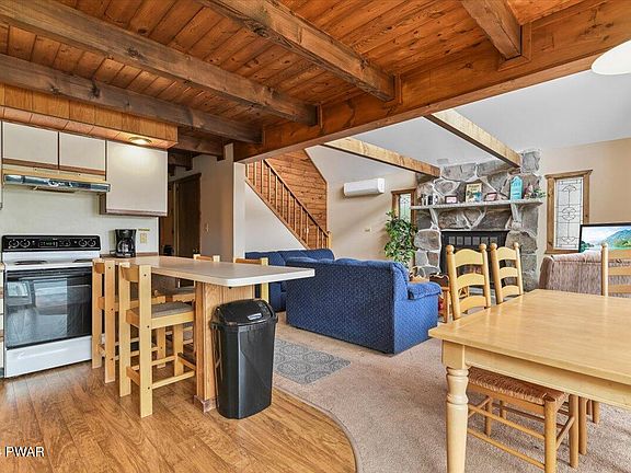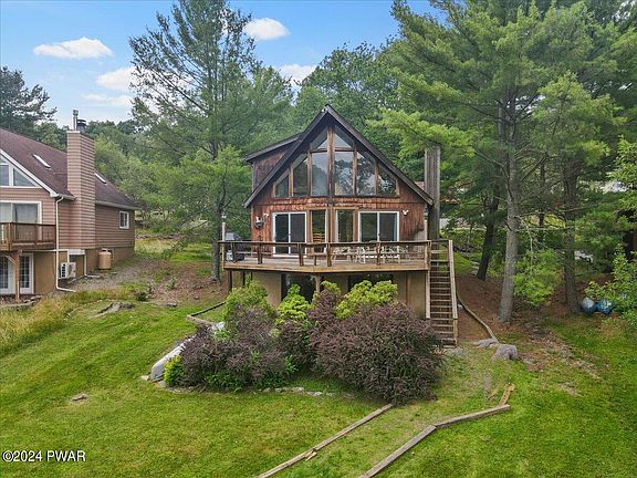 Welcome to your peaceful escape nestled on the shores of Deer Lake in Wallenpaupack Lake Estates. This charming chalet-style home offers that ''lake feel'' that everybody searches for, it also boasts expansive windows that frame breathtaking lake views from every angle. This home features 3 bedrooms, 2 full bathrooms, and an inviting open loft area overlooking the spacious living room below. Abundant windows flood the inside with natural light, creating a warm and inviting atmosphere along with showcasing an expansive view of peaceful Deer Lake. A clean, unfinished basement provides plenty of storage space and the potential for future expansion or customization. Stay comfortable year-round inside with efficient mini split units. Also enjoy the wood burning fireplace which will keep you warm and cozy all Winter long.Enjoy direct access to the lake and your own private dock. Embrace outdoor living with a spacious deck, ideal for relaxing or entertaining while soaking in the tranquil lake views. Situated in a serene setting, this home offers privacy and tranquility, yet is conveniently located close to all of the other great amenities WLE has to offer. This community includes access to beaches on non-motorboating lakes and Lake Wallenpaupack, a boat launch on Wallenpaupack, indoor and outdoor pools, gaming courts, paved roads, and so much more! There is a true sense of community with events and parades, there is a lot of fun to be had in WLE! You are also not far from restaurants and shops near Lake Wallenpaupack. Whether you're seeking a weekend getaway or a year-round residence, this lakefront chalet promises a lifestyle of relaxation and lake-living.