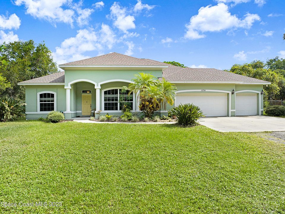 Beautiful Clean Country Home w/3 bdrms, a library & a 3 car garage on 1.36 acres. Quality construction w/poured concrete walls & cells filled w/re-bar every 16 inches, radiant barrier, dbl pane windows & hurricane shutters. (low utility bills w/electric under 175 $ per mo) Ceilings are 9-10 ft & floors are neutral tile w/carpet in the bdrms. This open plan has a huge eat-in kitchen & walk-in pantry, under cabinet lighting & sunny bay window eating area w/views to a private FENCED back yard.
