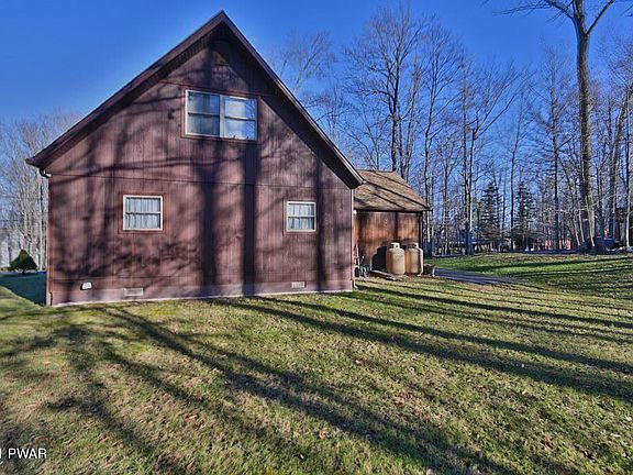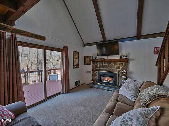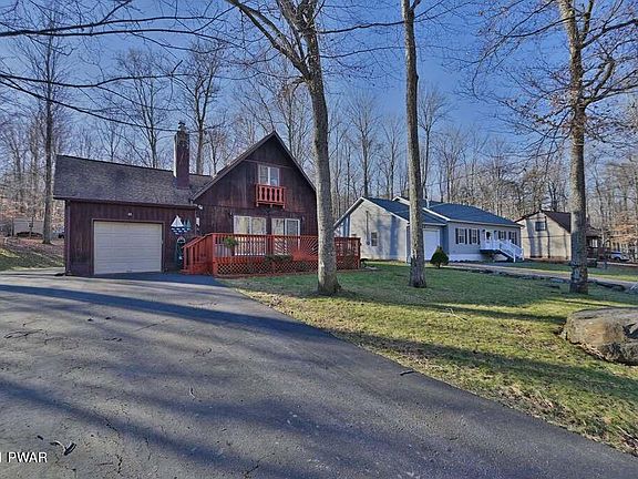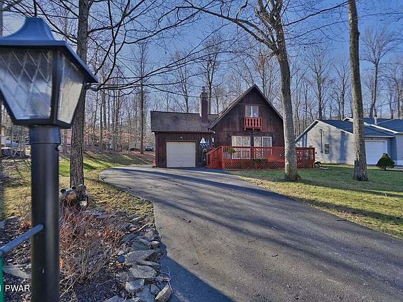 Check out this furnished chalet home in Wallenpaupack Lake Estates, a four-season amenity filled communityin The Northern Poconos, just two hours from the NYC and Philadelphia Areas. Nice level lot with room to play, paved driveway, garage and large deck. The main living area is open with cathedral ceilings, a beautiful stone fireplace with propane insert, and loft above. Three bedrooms, 1.5 bathrooms, laundry/mudroom on the main level, knotty pine ceilings. The community features include lakes, beaches, 2 outdoor pools, an indoor pool, a fitness center, a teen center, an adult lodge, tennis courts, hiking trails, gaming courts, ballfields, camping, boat ramp access to Lake Wallenpaupack and more. Central Sewer and water included in dues.