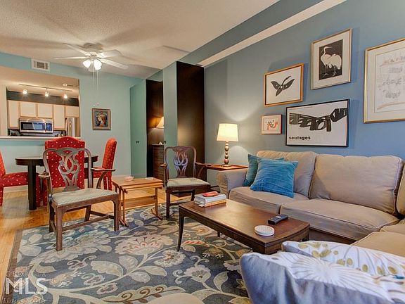 Great 1 bedroom/ 1 bath in the heart of Midtown. Unit includes hardwood floors, open floor plan w/kitchen breakfast bar overlooking living/dining room, and laundry room. Very comfortable and functional space. Enjoy the walk-out balcony overlooking a beautiful pool. Peachtree Walk amenities include a pool, dog park, gym, club room and gated garage. Also, owners enjoy private underground parking, gated entrances, a full-time property manager, full-time housekeeper, a maintenance superintendent, and excellent courtesy officers on-duty from 9 PM to 5 AM. The condo is within walking distance to MARTA, dozens of restaurants, Piedmont Park, High Museum, Alliance Theater, The Fox Theatre, supermarkets, wine shops and more. Fantastic price gives new owner the opportunity to make minor cosmetic updates to transfer this property into a showpiece!