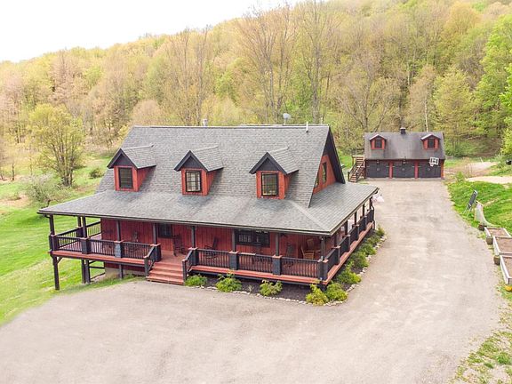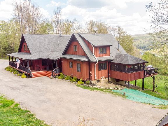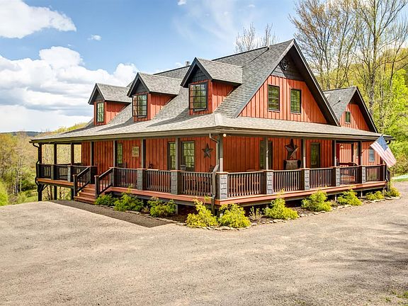 VERY SELDOM DOES A property LIKE THIS COME ALONG THAT HAS THE COMBINATION OF AMENITIES THAT THIS GORGEOUS CONTEMPORARY HOME OFFERS! 4445 square feet of living space on 3 floors. A long private driveway takes you to the home which sits on 22 acres with the most BREATHTAKING VIEWS FROM THE FULL WRAP AROUND PORCH. Nothing but MOUNTAIN VIEWS FOR MILES. close to STATE LAND, OQUAGA CREEK STATE PARK and CLOSE DRIVE FROM 17 and I-88. THE HOME FEATURES 3 FULL LEVELS OF LIVING SPACE. 6 AND 1/2 BATHROOMS AND 6 BEDROOMS. THE FIRST FLOOR features A MAGNIFICENT GOURMET KITCHEN built for ENTERTAINING WITH QUARTZ ISLAND, SEATING FOR 10-12, LIVING ROOM WITH GAS FIREPLACE AND DINING ROOM WITH CATHEDRAL CEILINGS with WOOD HANDCRAFTED CEILINGS, OPEN BEAMS AND A SECOND GAS FIREPLACE. THE OPEN FLOOR PLAN IS MADE FOR FAMILY GATHERINGS. WALK OUT from the MANY ENTRANCES TO THE DECK AND ENJOY the COVERED SCREENED IN SITTING AREA OR THE covered DINING AREA which overlooks the outdoor fire pit and paths thru the Fields. THE GAME ROOM IS PERFECT FOR THE FAMILY GAME NIGHTS. IF YOU WORK from home, THE FIRST FLOOR OFFICE AND 1/2 BATH ARE CONVENIENTLY located by the FIRST FLOOR ENTRANCE. THE MASTER BEDROOM SUITE HAS 2 spacious WALK-IN CLOSETS AND PORCELAIN TILE BATHROOM WITH SEPARATE SHOWER AND RELAXING TUB. THERE IS A GAS FIREPLACE ALREADY TO BE HOOKED UP AND DOORS ACCESSING THE DECK.THE SECOND FLOOR HAS 4 ADDITIONAL guest BEDROOMS WITH ENSUITE BATHROOMS, AND A DEN AND OPEN WALKWAY TO ONE OF THE BEDROOMS. THE WALKOUT BASEMENT HAS A YOGA STUDIO WITH LOTS OF NATURAL LIGHT FROM THE SLIDING DOORS OPENING TO TO THE LARGE BACK YARD. THERE IS FULL BATH, LARGE FAMILY ROOM AND ADDITIONAL BEDROOM. AN ADDED BONUS IS THE 3 + CAR CARRIAGE HOUSE WITH THE UPSTAIRS READY FOR YOUR ART STUDIO OR MORE LIVING SPACE. THIS IS THE MOST AMAZING PROPERTY AND MUST REALLY BE SEEN TO BE APPRECIATED. SCHEDULE YOUR PRIVATE SHOWING SOON.