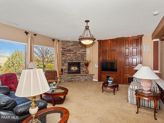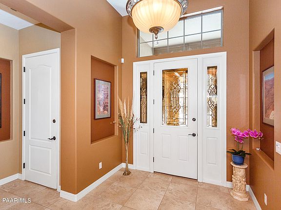Spectacular treasure in Yavapai Hills. Level, level, level single level home on elevated corner parcel. Loads of extra parking for guests. Beautiful Carrington home with formal and casual dining. Gourmet kitchen with granite and stainless Kitchen Aid appliances. Floor to ceiling built-ins in living room include living room TV. Three bedrooms plus prestigious office surrounded with windows. Garage is finished with coated floor, built-ins and storage. Home has new roof and new HVAC. Please use booties and respect COVID guidelines.Furniture available.