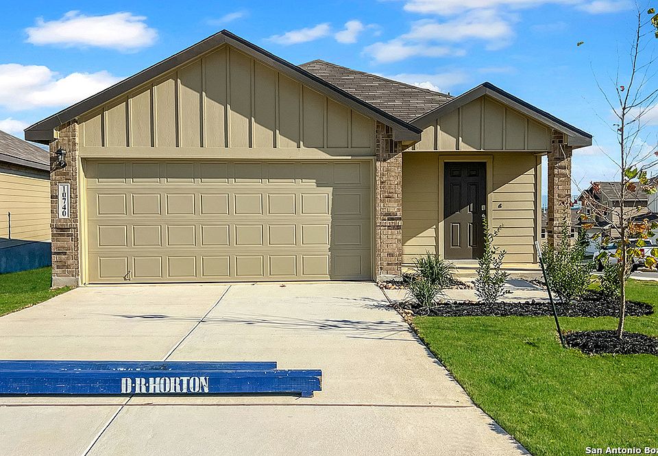 The Caprock is a charming one-story home featured at Applewood in San Antonio, TX. Featuring 2 classic front exteriors, this 3 bedroom, 2 bathroom home also offers 1435 square feet of living space and a 2-car garage. A front porch (per plan) welcomes you into the home and opens to the gourmet kitchen which includes quartz counter tops, quality cabinets, stainless steel appliances and an open concept floorplan with the kitchen flowing seamlessly into the dining room and living room. The main bedroom has an attractive ensuite bathroom that features a quartz vanity countertop and quality cabinetry. Enjoy additional storage with a spacious walk-in closet located off of the primary bathroom. Your secondary bedrooms all feature quality carpet flooring and a closet, and can be used as bedrooms, offices, work out spaces or other bonus rooms. The possibilities are endless with The Caprock floor plan. Additional features include sheet vinyl flooring in entry, living room, and all wet areas, quartz counter tops in all bathrooms and HOME IS CONNECTED base package. Using one central hub that talks to all the devices in your home, you can control the lights, thermostat and locks, all from your cellular device.