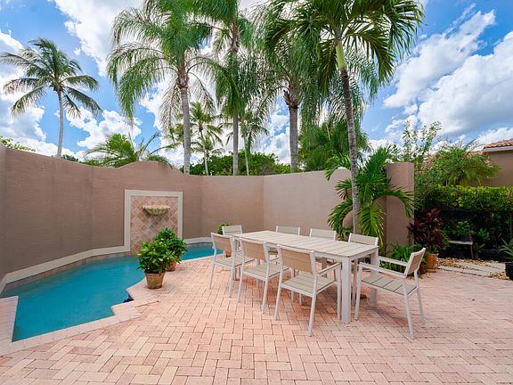 A true RESORT style Sabatello Mediterranean courtyard home. After entering the outside double doors, you come into the courtyard which has a seashell waterfall fountain flowing into the unique shaped pool. The home's front has multiple high windows which brings the outside inside. The large open concept plan has plenty of space for complete living and dining areas and 12 foot volume ceilings throughout. This home has a split plan with a huge master suite and one bedroom can be used as a den or office. The home has a new gas hot water tank, gas stove, gas dryer and a gas pool heater. The kitchen is new with new river granite countertops specked with garnets and stainless steel appliances. Both bathrooms have been updated and the home is bright and throughout