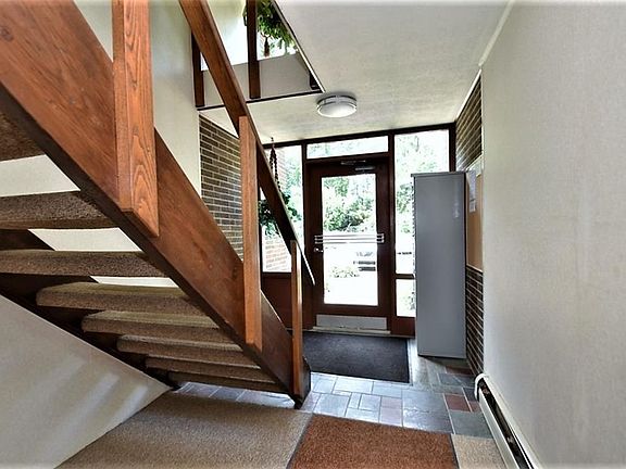 Why pay rent when you can own?!?! Affordable, care free living is at your fingertips with this lovely 2nd floor condo. This one bedroom unit features new neutral carpeting in the living room, dining room and bedroom. The kitchen has newer luxury vinyl plank flooring with a dishwasher, refrigerator and stove. Kitchen space is maximized by a built-in table. The full bath is equipped with a shower/tub combo. The balcony off of the living room overlooks the pool and wooded landscape. The low maintenance fee includes gas, water, sewer, trash removal, snow removal, recreation and landscaping. A dedicated parking spot is located just outside the front of the building. A shared laundry room is located on the first floor.