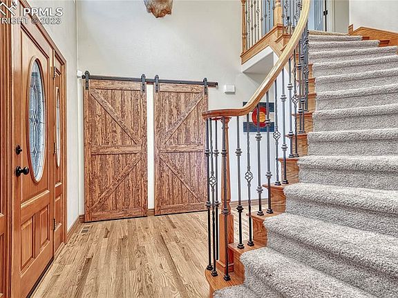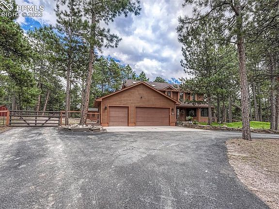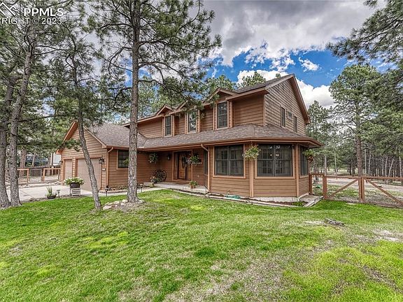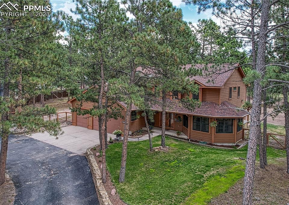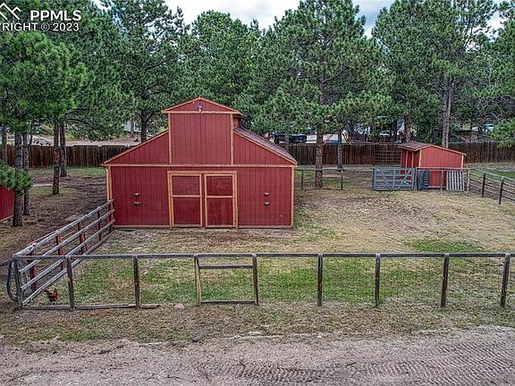 A home with all the extras! Don’t miss this 5BD/4BA/3CAR home on 2.85 acres in Black Forest with a horse barn, enclosed gazebo, chicken coop, 2 sheds, treehouse and plenty of parking for an RV. A circular drive delivers you to a welcoming entry with 2-story foyer boasting hardwood floors and a grand staircase. Adjacent is the living room featuring several large windows and crown molding. The formal dining room features a tray ceiling, crown molding, wainscoting and hardwood floors. Follow the hardwood floors into the large kitchen with granite countertops, island with seating, crown molding and eat-in breakfast nook with lovely backyard views through a bay window. Refrigerator included! Hardwood floors and crown molding continue through the great room, which also boasts a pellet stove and walk-out to the 54’x14’ covered stamped concrete patio with ceiling fan. The laundry room and powder room complete the main level. Upstairs is the owner’s suite with adjoining 5-piece bath, vaulted ceiling, walk-in closet, skylight and walk-out to a composite wood deck. Also upstairs are 3 additional bedrooms and a full bath. Downstairs is a family room, bedroom with walk-in closet, office, large flex space with a pellet stove, ¾ bath and a storage room with built-in shelves. New leach field 2023. Don’t miss out on the benefits of this property AND the convenience of reaching I-25, the Powers Corridor, Academy School District schools, hiking trails, shopping and entertainment all within a 20 min. drive.