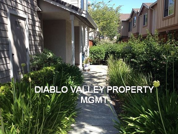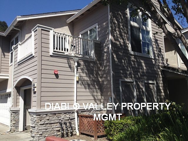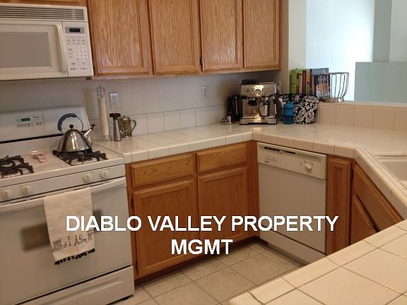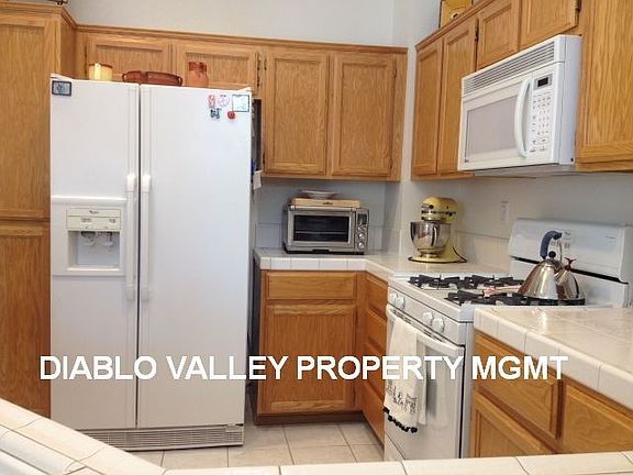 This adorable 2 bedroom/2 bath end unit town home includes 1 car garage plus 1 designated parking spot. Kitchen includes gas stove, built-in microwave, dishwasher, tile counters, lots of cabinets for storage, and refrigerator. Separate dining area with beautiful hardwood floors that opens to the balcony. High vaulted ceilings in living room with lots of natural light and wood burning fireplace. Spacious master bedroom with mirrored closet doors. Dual sinks in master bathroom. Central heat & air. Dual pane windows. Beautiful location surrounded by hills. Community Pool. Easy freeway access.