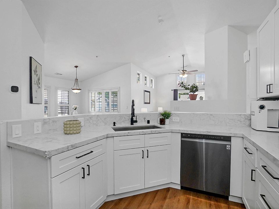 This beautiful end unit townhome like condo is move in ready and a must see! Step inside to discover brand-new luxury vinyl flooring and recessed lighting that flows throughout the entire home, creating a seamless look. The kitchen is fully renovated with new shaker cabinets and stunning quartz countertops. From the kitchen you have direct view into the separate dinning area and spacious living room which is perfect for entertaining. As you head into the hall you will find a bedroom, bathroom and the primary suite. The home also comes with an enclosed deck where you can relax and take in breathtaking views of rolling hills and lush trees. Additional perks include a finished garage with epoxy flooring and lots of custom shelving providing extra storage. This home is located in the highly desirable CA Highlands community in West Dublin. It is close to scenic hiking trails, parks, and highly rated schools, this condo offers the perfect blend of tranquility and accessibility. Plus, it's just minutes from BART, freeway access, dining, and shopping.