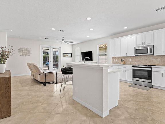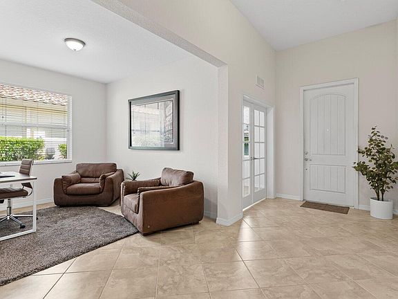 Highly popular Quartz model 1-story *3 bedroom + DEN + Pool*. You will see why this was one of the most sought-after floor plans - perfect open concept & spacious design. White kitchen with 42in maple cabinetry, stainless appliances, subway tile back splash & quartz counter tops. 3-way split bedroom floor plan has a private den w/ double French door entry. 2 secondary bedrooms are tucked away in a private hallway & share a 2nd bath w/ double sinks. All bedrooms have engineered hardwood flooring - no carpet! Master bedroom is a true sanctuary in rear of home w/ 2 large walk-in closets and views of the pool. Ensuite spa-like bath has dual vanities, roman tub and separate shower. IMPACT GLASS windows and doors make storm prep a breeze! Enjoy relaxing by the pool and enjoying lake views all protected under your screened patio. No side neighbors and adjacent to large green space.