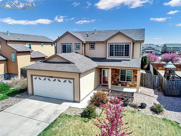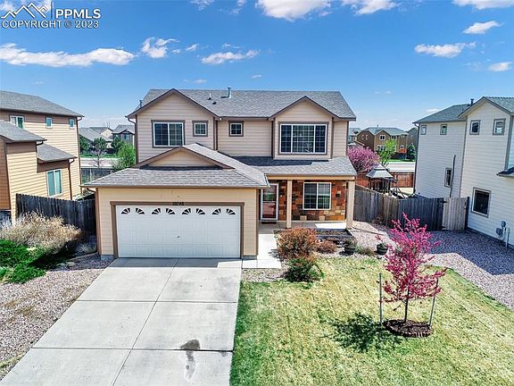 Delightful 4 bedroom home! You will feel right at home as soon as you walk up to the front porch. Main floor includes living room, dining room, roomy kitchen and bedroom. The kitchen is perfect! There is plenty of counter space, cabinet storage, and a pantry! The kitchen connects to the sizeable back yard with extended patio with sliding glass doors. Ceilings are higher which makes the home feel spacious! Laundry room is on main level as well. Upstairs includes a large primary suite with a walk-in close and ensuite bathroom. There are two additional bedrooms upstairs along with a loft; perfect for a reading or workspace area. Lorson Ranch is perfectly located close to parks, walking trails, Ft Carson, and Schriever.