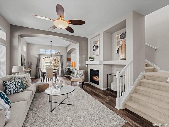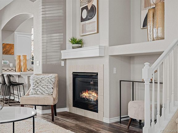 Flawless in Firelight. This stately 4/bed & 4/bath two-story pulls out all the stops. First impressions include an open concept layout and 10-ft ceilings, an array of windows offering abundant natural light, a cozy gas fireplace and mantle, and barnwood vinyl flooring. A quiet and private main floor office is outfitted w/glass french doors and sits adjacent to the powder room. The living area is adorned by a large archway, built-in nooks, & extends to the eat-in dining room complete w/ a sliding door that accesses the Trex deck & tree-lined backyard. A second matching archway opens to a stylish kitchen that is highlighted by bartop seating, a kitchen island, tile countertops & backsplash, Whirlpool and KitchenAid stainless-steel appliances, pull-out shelving & two-tone cabinets. Upstairs, the primary bedroom is highlighted by a tray ceiling, lavish walk-in closet, & resourceful 5-piece bath. The spacious secondary bedrooms offer ample storage, custom blinds, ceiling fans & a dedicated full bath with double vanity. Back downstairs, the custom-finished basement is “movie night” ready and includes a Sony TV + Polk 6-speaker surround sound that is optimum for an entertainment lounge, rec room, or home gym. An additional powder room and laundry area occupy this space with included washer/dryer. The backyard features an extended deck for entertaining, a 6-ft privacy fence, plenty of green space - yet is easy to maintain with mature landscaping. Other perks include: coveted south-facing driveway exposure, a bonus 3-car tandem garage, and Nest thermostat + Ring doorbell. Less than 5-mins to Firelight Park, Red Tail Park, Mountain Ridge Middle and Mountain Vista HS (in the acclaimed Douglas County School District). Enviable access to over 8,200 acres of Backcountry Wilderness and four state-of-the-art recreation centers featuring pools, pickleball courts, climbing walls, + over 329,000/sq ft of workout facilities and event space. Your forever home and dream community awaits!