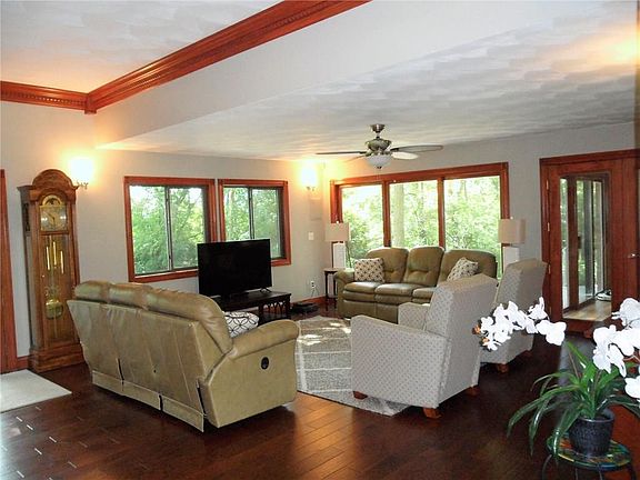 Breathtaking, serene, privacy are only a few of the words that describe this beautiful custom built brick ranch on a wooded lot offering 15 ac with stocked pond and a stream running through it. This home features an open concept floor plan with an abundance of windows to let the sun and nature envelop you. The great room/dining area greet you with beautiful crown molding, new wood flooring. The kitchen offers newer cabinets, built in oven and microwave. Island with quartz counter, sink and dishwasher (2017). Master en-suite offers beautiful views, new 50 oz nylon carpet, remodeled custom tiled-step in shower with glass doors, newer vanity and walk-in closet. Bedroom 2 offers newer carpet. Office could easily be made into 3rd bed. New laundry cabinets with granite top, luxury vinyl flooring also in kitchen, office and hall bath. Multiple doors access a wrap around deck. Also an attached 2 car gar plus a 40x40 pole barn with cement floor and electric, door for RV.