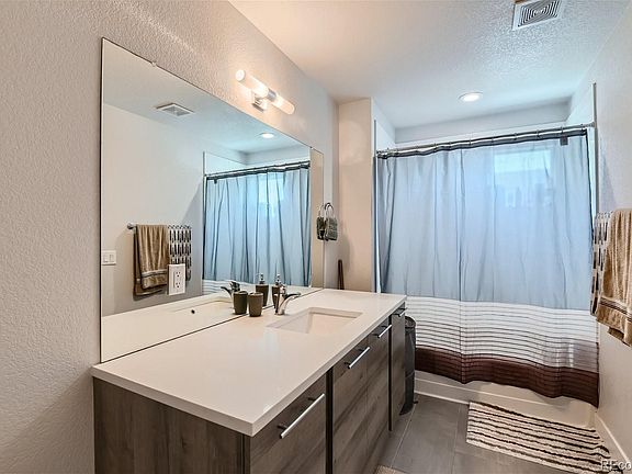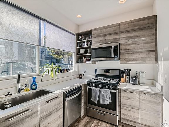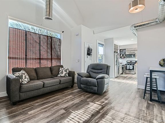 Modern, corner lot townhouse in Lakewood's West Line Village neighborhood! Enter into an open layout with extremely high vaulted ceilings and LVP flooring throughout. The bright kitchen includes Whirlpool stainless steel appliances (all included), soft close Cassis cabinets, bonus kitchen storage cabinet and quartz counters. A petite dining area just off the kitchen leads to the large, open living room space. A substantial bathroom with soft close cabinets, quartz counters and subway tile shower with tub complete this spacious main floor. The homeowner is living in the space as a studio, but this space could be used for a home office, additional seating, board game area, or whatever you choose! A large, airy loft completes the home, just add stairs! Looking for more storage? Check out the attached, oversized and finished one car garage! The townhome is ADA compliant and includes central a/c as well as the washer and dryer. Attend the many neighborhood get-togethers, ride your bike to Sloans Lake or Edgewater Public Market, jump on the light rail to downtown/Union Station or go for a stroll on the trail! All are just steps from your front door!