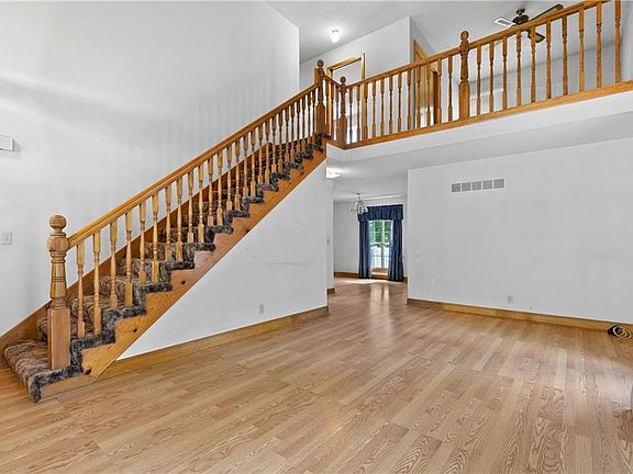 This two-story has easy-care vinyl siding exterior white vinyl privacy fenced back yard. A lovely large deck overlooks the treed backyard. Easy living open floor plan with impressive stone fireplace, soaring vaulted ceiling, and a loft/office looking over all of it! The master bedroom will accommodate your king-size bed and has a private bathroom and walk-in closet. There's much more room in the finished basement...4th private bedroom with an ensuite bathroom, office/hobby room, + workshop in the unfinished walkout end of the basement. Bring your best paint and flooring ideas to make this one-owner your own!