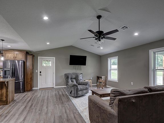 This three bedroom two bath home is a spacious and modern open concept design. The living room features vaulted ceilings, creating a grand and airy atmosphere. Kitchen includes an island, eat at bar, and pantry! The Primary bedroom has a luxurious walk in closet, and Primary Bathroom has an impressive fully tiled walk in shower. Outside You will find the covered front porch with stamped concrete, situated on almost 3 acres with Beauty surrounding. Along with a drive under carport with a room for storage. Call today for a private tour!