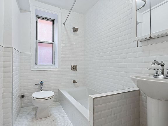 Brand new windowed bathroom with subway tiling, new tub, vanity and medicine cabinet. New brushed silver shower accessories. Classic style.