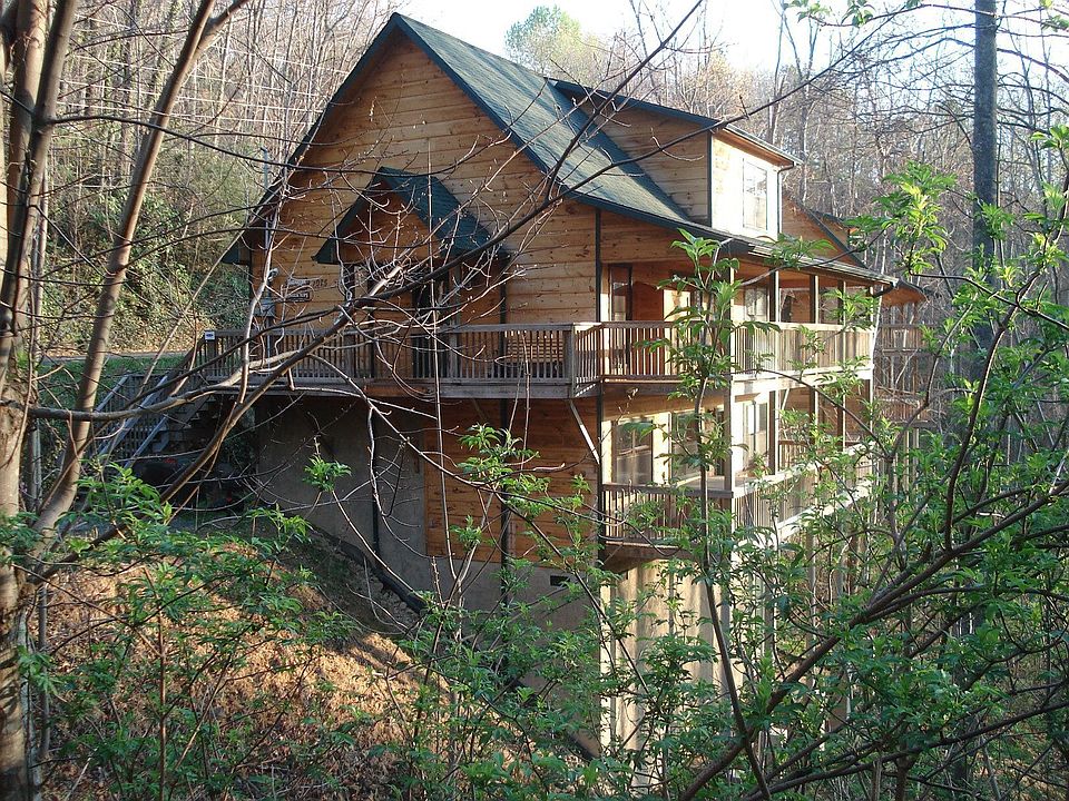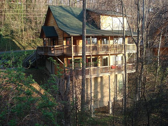 Beautiful 3 BR/3 BA log cabin located off Ski Mountain in Gatlinburg in Chalet Village; Sleeps 10! Gorgeous Cathedral ceilings, featuring updated furnishings including a gas log fireplace. Fully equipped kitchen with dining table that will seat six. On each level you will find one spacious bedroom with luxurious king size bed, large closet, dresser, TV's w/ DVD w/adjoining full bathroom w/ tub and shower. Full size washer & dryer located on the main level for your convenience. The lower level, has pool table, electronic dartboard, Stereo with CD player, a futon and 32 inch Plasma TV with DVD/VCR and a collection of DVDs. There are two full-length decks with a patio table, chair & rockers. A relaxing four person hot tub is located on the lower level and a charcoal grill for some outdoor cooking. Guest may enjoy the amenities including the use Clubhouses with pools, baby pools, pool tables & tennis courts.