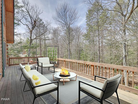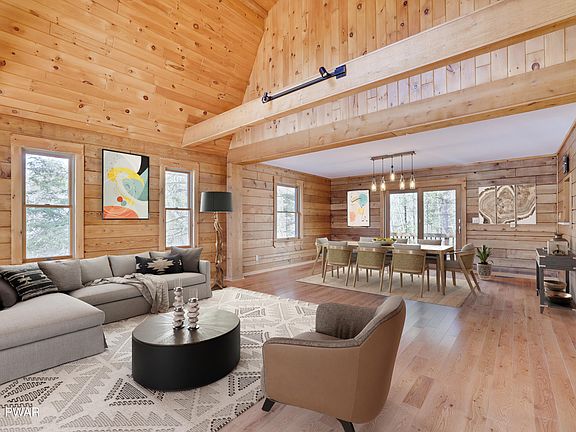 Stunning Log Home with Dutch-Inspired Architecture and Lake Rights!Welcome to this enchanting true log home nestled in a serene, amenity-filled private community. With its unique double Dutch style architecture, this property exudes character and warmth. Let's explore the features that make this home truly special: Log Cabin Aesthetics: The exterior showcases handcrafted logs, creating a rustic ambiance that seamlessly blends with the natural surroundings. Imagine sipping your morning coffee on the back deck, enveloped by the scent of pine. Relax in the evening around a firepit. Spacious Living Areas: Great Room: Step inside the vaulted great room, where knotty pine ceilings soar overhead. Open Dining Room: The dining room opens to the great room and has access to the deck with views of the green-belt backyard.Kitchen: Double-oven, gas range, stainless steel appliances, and deep sink where the chef can enjoy preparing meals.Bedrooms and Bathrooms: Five Bedrooms: Plenty of room for family and guests! Two Bathrooms: Conveniently located, these bathrooms feature modern fixtures and warm wood accents. Bonus Room: On the main floor can be used as an office or extra sleeping area.Lake Rights:Access to the two pristine private community lakes awaits as well as a marina on Lake Wallenpaupack! Whether you're a swimmer, kayaker, simply love lakeside picnics, or want to dock your powerboat on the ''Big Lake'', this privilege is yours. Outdoor Oasis:Deck with a View: The rear deck overlooks the lush green belt, providing a tranquil spot for relaxation and entertaining.Deep Garage: Park your vehicles or use it as a workshop--the choice is yours.Bonuses: This home comes with a gas golf cart to buzz around to all the community amenities.A new hot tub, still in the original packaging, is ready for a lucky home buyer.