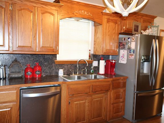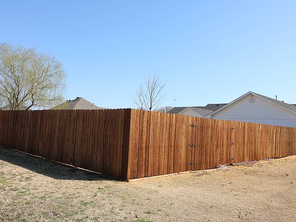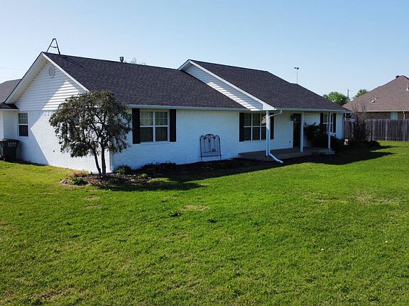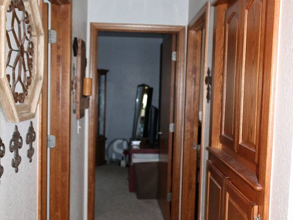 Vaulted ceilings in the living room, kitchen & dining room; Breakfast bar, Patio door to 10x20 covered patio, Hall storage unit, Hall bath has double sinks with shower/tub combination; Bedrooms 2 & 3 have walk-in closets & built-ins; Pan ceiling in main bedroom, bathroom has a jacuzzi tub, shower and two vanities; Utility room has a work space with a hang-up bar, and oak cabinets. 9x12 cellar; Garage is 25x27 with remote openers, privacy fence, storage building 12x20 with electricity