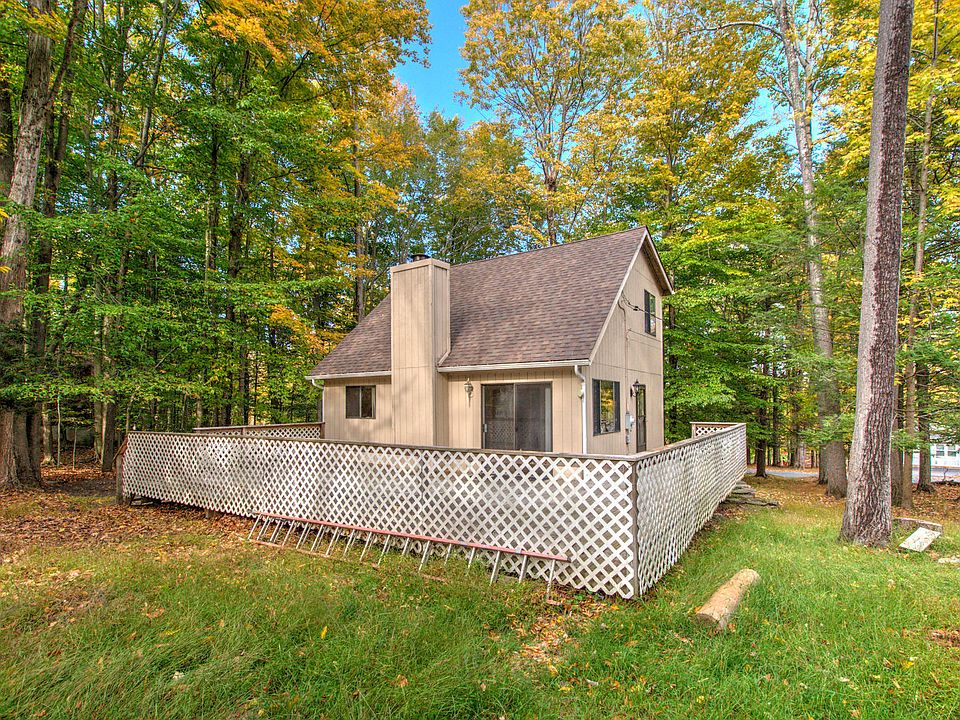 Charming 3 Bedroom, 1.5 Bath home in the amenity filled community of Wallenpaupack Lake Estates. This home features an open floor plan with cathedral ceilings, hardwood floors throughout, a large, private deck on back of home, a propane fireplace & French doors into the first floor bedroom. 2nd floor features 2 additional bedrooms & a full bath. New roof in 2020!
