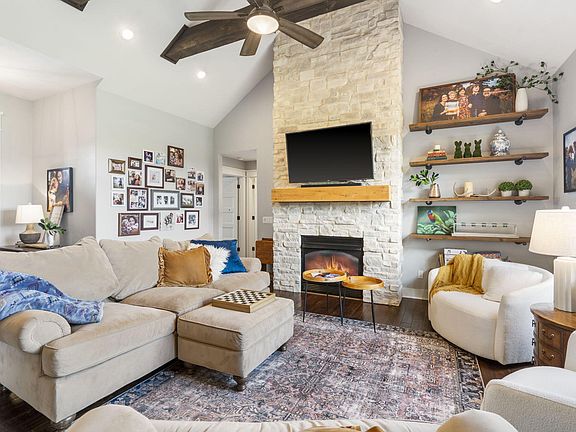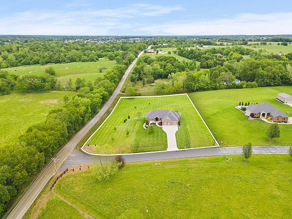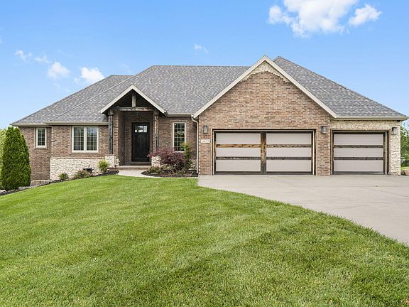 NEW roof and gutters!! Custom built 5 bed + office, 3 bath, walk-out basement home in Nixa! Situated on a 3 acre corner lot, this property features an all brick exterior, storm shelter, walk-out basement, and so much more! Inside, enjoy a beautiful living room with a vaulted + beamed ceiling, a stone propane fireplace, and an open concept floor plan to the dining/kitchen area. Dining space offers a coffered ceiling w/French doors to the screened-in deck space. The kitchen provides a large island w/barstool seating, stainless appliances including a double wall oven, 5 burner gas range w/pot filler, subway tile backsplash, and walk-in pantry. Off the kitchen is access to the 3 car garage and laundry room with extra cabinet storage. Primary bedroom provides abundant natural light, walk-in tiled shower, dual vanities, soaking tub, and large walk-in closet. Split bedroom floor plan with 2 more bedrooms and a full bathroom on the main floor. Walk-out basement boasts a large recreation room, wet bar w/Alder cabinets, family room, 2 bedrooms, a full bathroom, den/office space and storm shelter. You will love entertaining on the back deck with one area screened in and a covered patio below. Other features include: water filtration system, irrigation system, outdoor gas grill hookup, gas firepit, and outdoor speakers! Quick access to Hwy 13, this is a must-see home! Playset negotiable.