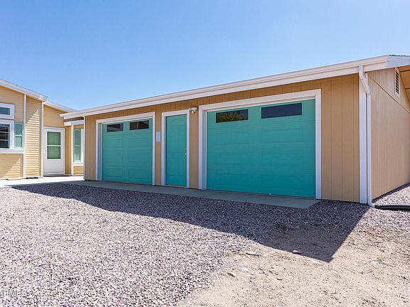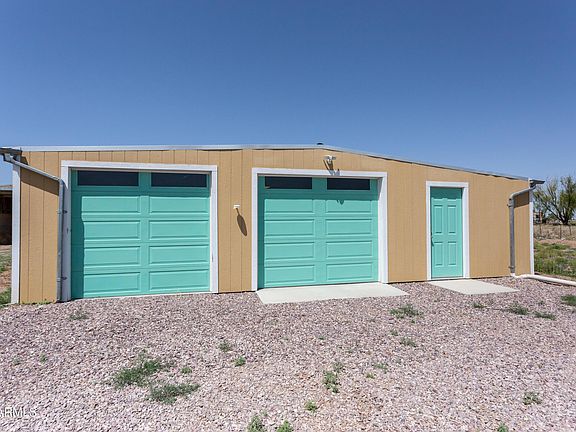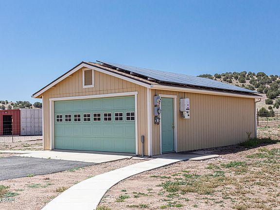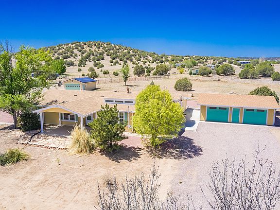 Rare find in Chino Valley on 3 acres. Triple wide home with 2812 square feet, offers 3 separate detached garages, 3 covered stalls for horses or extra storage, full perimeter fencing, plus cross fencing with 3 gates. Two of the gates are solar electric. A built-in workshop in the NW garage has A/C unit, and a divider wall between the two bays. The inside of home has an open floor plan with designated entertaining areas and custom features throughout. Front covered entry opens up into the large living room that has morning sun exposure, pellet stove, and accent windows near the ceiling with electric blinds. The second living room has a wet bar, a joining fireplace with first living room, and an open floor design with kitchen and formal dining. Solar on garage is paid for and included!