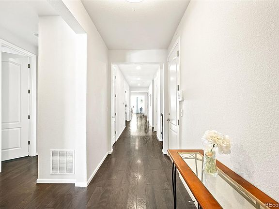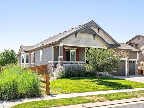 Positioned in the back nine of Buffalo Run Golf course, this ranch home sits on a spacious .33-acre corner lot. Picturesque landscaping surrounds the exterior as a covered front porch invites outdoor relaxation. Across from Reunion Park, offering convenient access to the community pool and recreation center, making it easy to enjoy these popular amenities. Well-suited for entertaining, an open floorplan flows with beautiful hardwood flooring throughout. A fireplace anchors the living area as natural light streams in through wide windows. The home chef is treated to a modern kitchen featuring stainless steel appliances, all-white cabinetry and a center island with seating. A convenient main floor laundry room features a washer and dryer set. A vaulted ceiling expands the scale of a dining area with outdoor connectivity to a covered patio and an expansive backyard with a firepit and an enclosed dog run. Two additional main-level bedrooms provide space for a home office or guests. Downstairs, a fully finished basement hosts a large rec room, a versatile bedroom and a bath. Additional storage space is found in a 3-car attached garage.