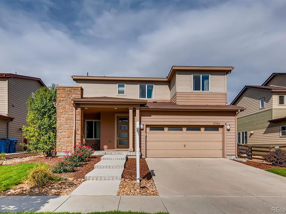 Great location! Beautiful former "Model Home"! Well maintained "South Facing" 2-story with open floorplan in the coveted and award winning Reunion neighborhood! The great open concept design features a family room as well as dining room that flow into a gourmet kitchen with huge beautiful granite center island countertop and custom backsplash to the ceiling, pendant lights, beautiful stainless steel appliances with access to the covered patio. The second story offers a large master bedroom with a luxurious 5 piece master bath and two secondary bedrooms and additional full bath. A spacious loft area works well as an additional work space or relaxation area. A large upper level laundry only adds to this perfect layout! Professionally finished garage floor with finished garage walls are a great addition. An unfinished but insulated basement includes plenty of storage or the opportunity for your personal design imagination. $8000 Whole Home Water Filteration System and In-home speakers included! All this in a wonderful location! A short one-block walk to all the Reunion amenities including: The coffee shop, community pool, recreation center, walking trails and open space! Near DIA, dining, grocery and highways for commutes. You won't be disappointed. A perfect place to call home!