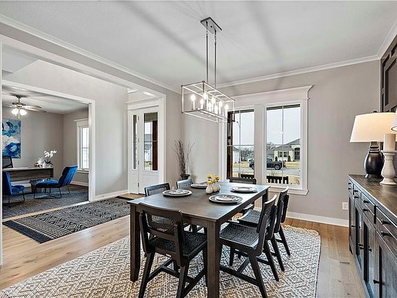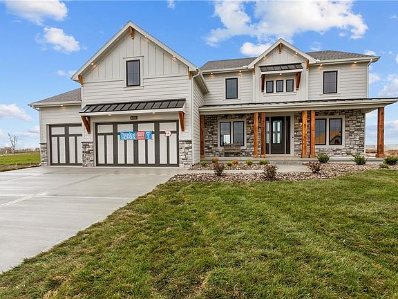 Model Home Price Way Below Reproduction! As Seen On HGTV’s House Hunters!! Inquire for Details! Don’t miss the opportunity to make this award-winning model home yours! The Jefferson expanded by Patriot Homes is perfectly situated on a cul-de-sac lot near the community swimming pool and hammock garden and showcases classic farmhouse design and several upgrades inside and out. The main level includes a drop zone, laundry room, powder room, well-equipped kitchen, breakfast nook, dining room, study, and great room with two-story bay windows as well as an idyllic master bedroom suite with free-standing soaker tub, walk-in shower with dual shower heads and Bluetooth audio system. An open staircase leads to the upper level offering four bedrooms, three full bathrooms, and second laundry room. A rare find in new construction, the lower level is already finished with 1265-square-feet of additional living space including a recreation room, wet bar, bedroom, full bathroom, and two large unfinished storage areas. Extras enhancing the overall convenience and ease of owning this home include an irrigation system, three-car garage with openers for both doors, high-efficiency furnaces, whole home humidifier, and 50-gallon electric water heater. Taxes, sq footage, room and lot sizes are estimated. Cadence is a great Hunt Midwest community with swimming pool and trails. Located near major highways and interstates allows for easy access to downtown Kansas City, the new Kansas City International Airport, and several of the area’s top shopping and entertainment centers.