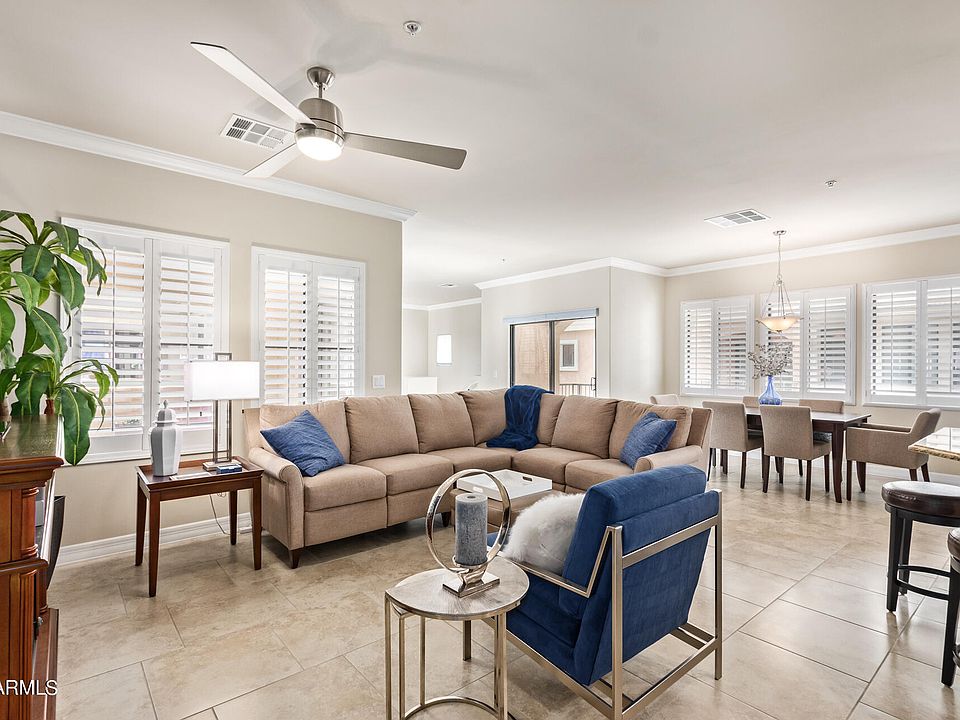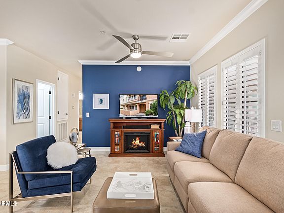 This stunning condo has been meticulously maintained by its long time Owners. A palatial 2000+ square feet, featuring 3 bedrooms, 2 bathrooms and 3 separate balcony/patio spaces. In addition, a functional office/flex space allows those who work from home, a dedicated area. The east facing main patio is a true extension of the living area... generous in size, it's a perfect spot for morning coffee or an end of day cocktail. Custom paint, crown molding and plantation shutters throughout the home are additional luxuries. The attached 2 car garage also houses the water softener and newer hot water heater. Located in the center/rear of the community, away from Shea Blvd. The resort-like pool and spa are steps away, the pool, heated year round. Available fully furnished! Only two miles from the 101. Nearby entertainment/dining: Scottsdale Quarter, Kierland Commons, Old Town Scottsdale