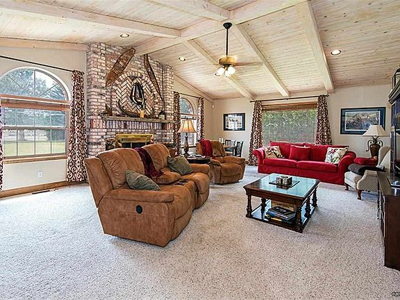 Close to town and yet miles away! This 2 acre parcel has over 100 trees and lush lawn. Incredibly private country living ranch home features a front porch with mountain views and a covered patio on the rear. The home has been updated throughout. Open living room, spacious master and a kitchen with breakfast bar and nook. Two of the bedrooms are joined by a Jack & Jill bathroom. Separate indoor spa building. Large RV Garage with upstairs Bonus room. Peaceful Country living at its finest.