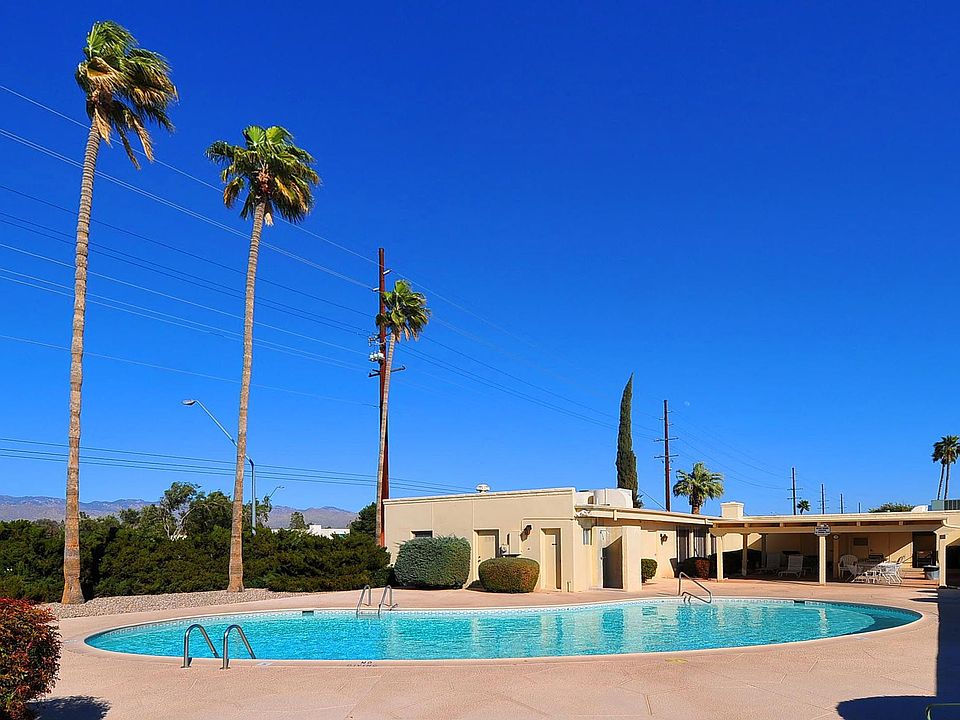 CHARMING single-story 2 bedroom 2 bath townhome in quiet & desirable El Dorado community. Excellent central eastside location. Savor breathtaking MOUNTAIN VIEWS right from your living room! Beautiful COMMUNITY POOL & recreation center (only $55/mo HOA!). Across the street from Dorado Golf Course, a premiere 18-hole public golf course, & blocks to shopping, including Trader Joe's & Walmart. Inside is bright & well-maintained featuring a spacious living & dining area & gorgeous hardwood & tile flooring (NO CARPET). You will treasure the sun-soaked Arizona room. Eat-in kitchen boasts GRANITE kitchen counters. ALL APPLIANCES included. GARAGE/CARPORT. Generously-sized master offers a huge WALK-IN CLOSET, private en-suite bath. Peaceful & private enclosed back patio. SOLAR. 2yr ROOF WARRANTY.