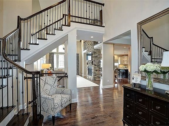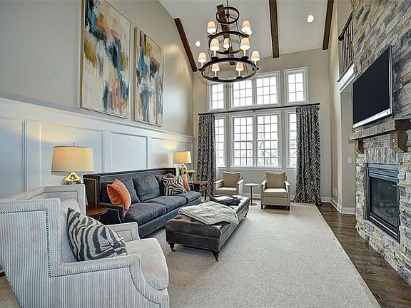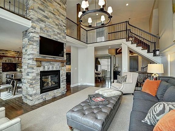 Dramatic and refreshing for a house to be architecturally exciting. Two sided stacked stone fireplace that soars as well a wall of windows overlooking a rear yard and open space. The house has signature moldings, custom woodwork, gorgeous hardwood flooring, glazed custom kitchen cabinetry, quartz counter tops, Bosch SS appliances, contrasting island, designer back splash, and wet bar. Main floor den with custom cabinetry and desk. Main floor master with tray ceiling, luxurious master bath with gorgeous shower and separate tub. The second floor boasts of a loft (living room) overlooking the great groom. Three large bedrooms and two more designer baths. The lower level is walk out and the area under the garage is excavated for even more lower level space. There is a low maintenance deck off the kitchen with stairs to rear yard.