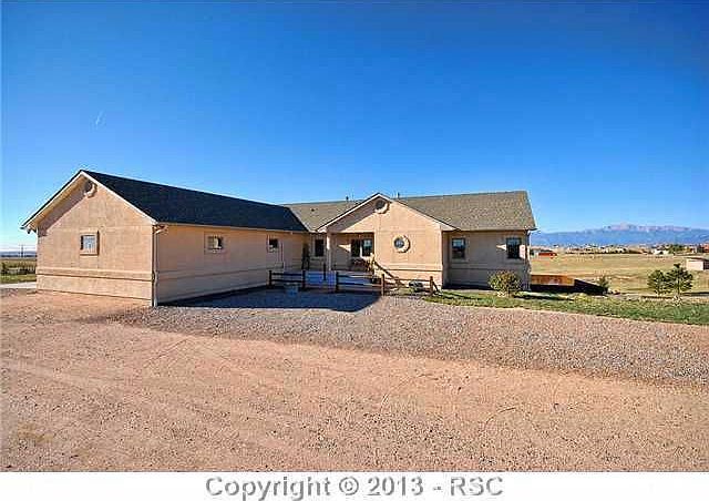 Complete custom, stucco ranch style home on 3+ acres with unbelievable Pikes Peak and Mountain views. Constructed of the highest of quality with tile floors, center staircase to lower level, beautiful formal living, a real cook's kitchen with huge baking island and nook. Off of the nook is a covered deck with composite floor overlooking the city lights and the Front Range. Main level master plus an office/library off of the master and an additional secondary bedroom. Wonderful laundry area that opens to a three car,